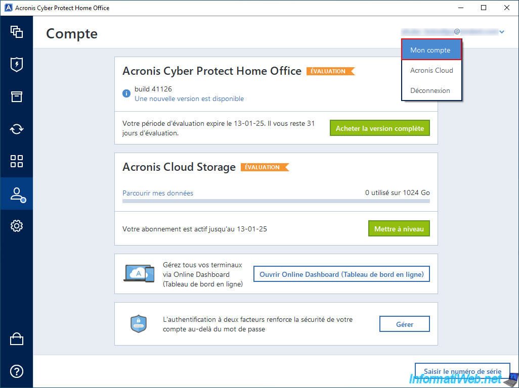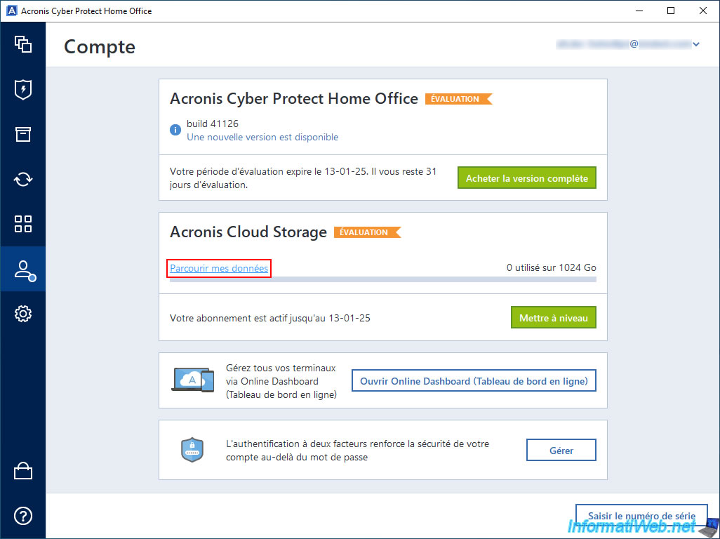 The other way to access Acronis Cloud from Acronis Cyber Protect Home Office (True Image) while being automatically logged in with your Acronis account is to go to the "Account" section of Acronis Cyber Protect Home Office (True Image), then click on your Acronis account email address displayed on the top right.