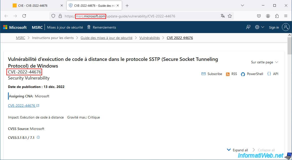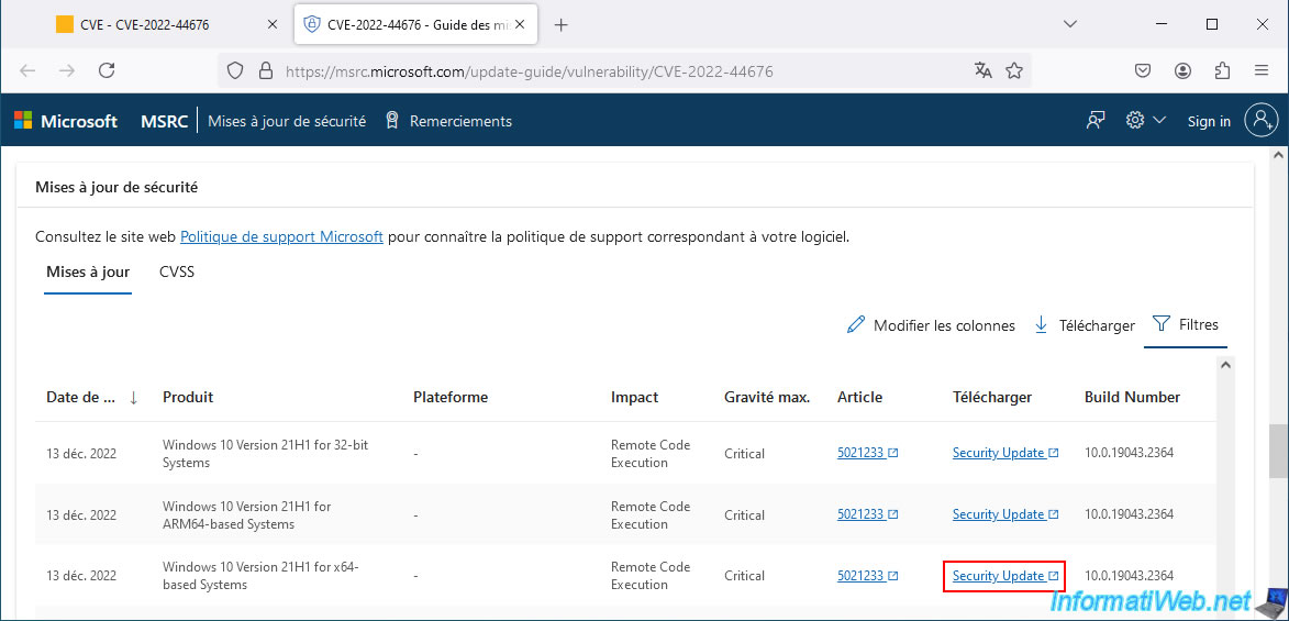 On the "MSRC" page of the Microsoft website, you will find a "Security Updates" section that allows you to find out which security updates address the selected vulnerability.