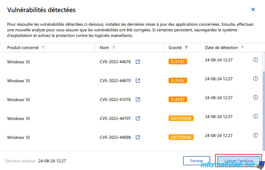 If vulnerabilities are found, Acronis Cyber Protect Home Office (True Image) will show you the affected product (in our case: Windows 10) and the name of this vulnerability (which always starts with "CVE-...").