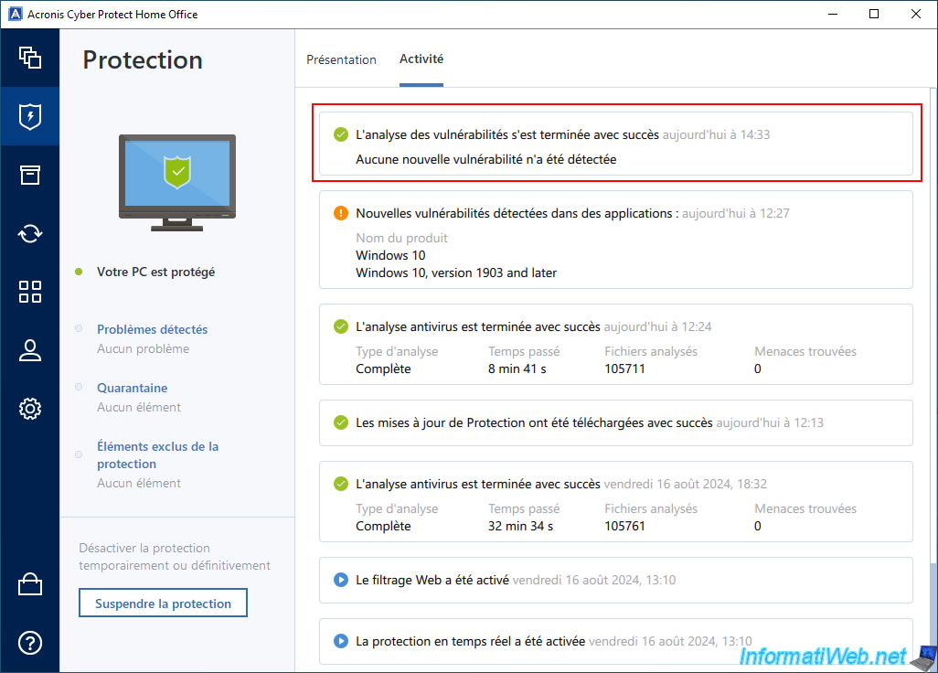 In the "Activity" tab of the "Protection" section, you will also see the message "No new vulnerabilities have been detected" appear.