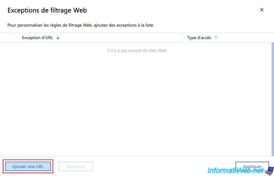 In the "Web Filtering Exceptions" window that appears, click the "Add URL" button.