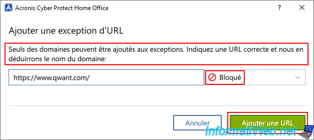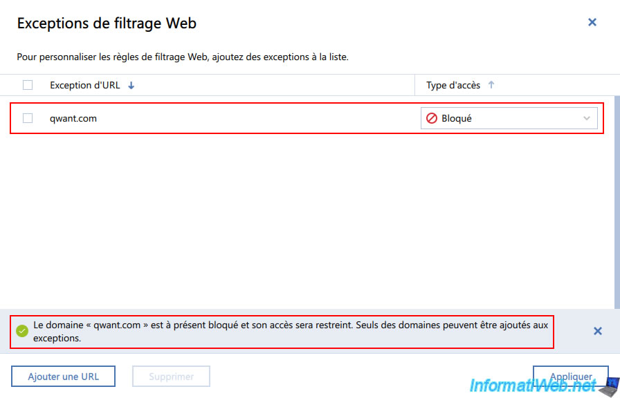 The domain "qwant.com" is now blocked and its access will be restricted. Only domains can be added to the exceptions.