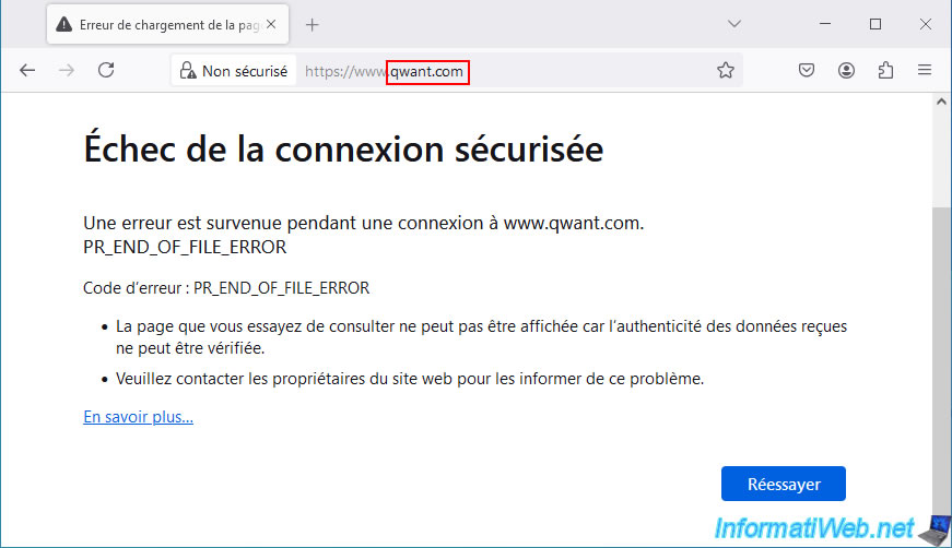 If you try to access the HTTPS website that you just blocked, you will see that you no longer have access to it and that your web browser will probably display an error due to a secure connection problem.