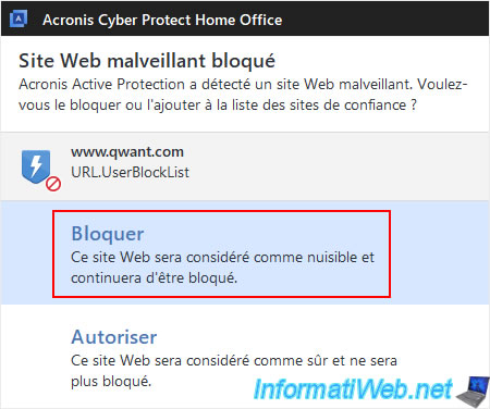 At the bottom right of your screen, you will also see a "Malicious Website Blocked" notification appear allowing you to continue blocking access to this website or allow it to disable this blocking.