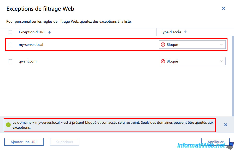 To block access to this website, click on the "Manage exceptions" button of this web filtering.
