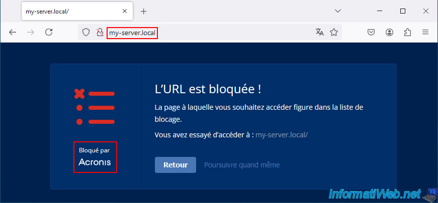 In case of a (non-secure) website accessible only in HTTP, you will see an error page "URL is blocked!" appear with the message "Blocked by Acronis".