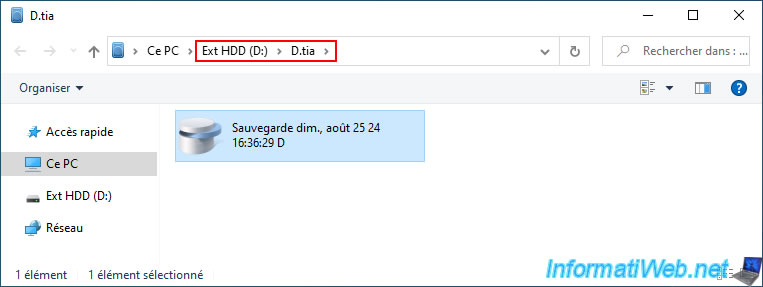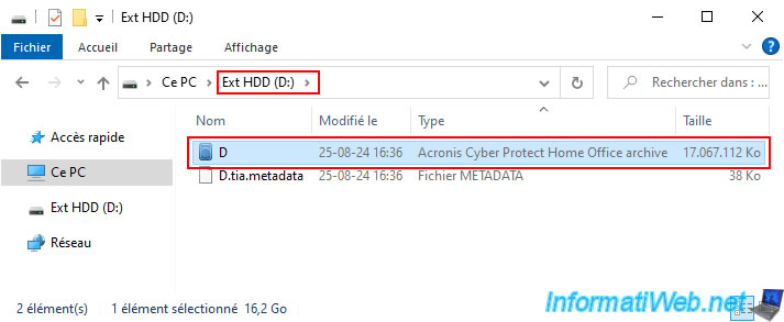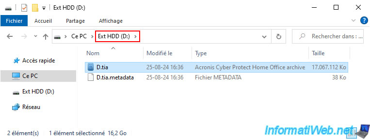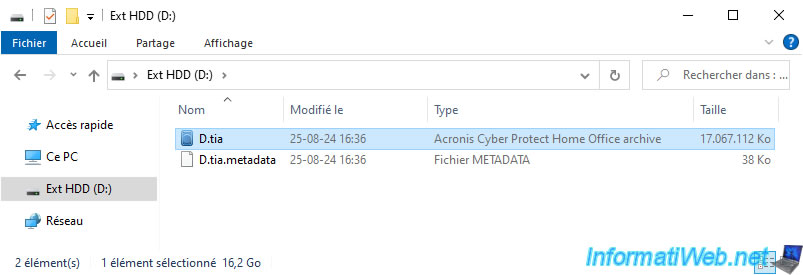 On your external hard drive, you will see that a ".tia" file (containing encrypted archived files) and a ".tia.metadata" file (necessary for this archive to work with Acronis Cyber Protect Home Office (True Image)) have been created.