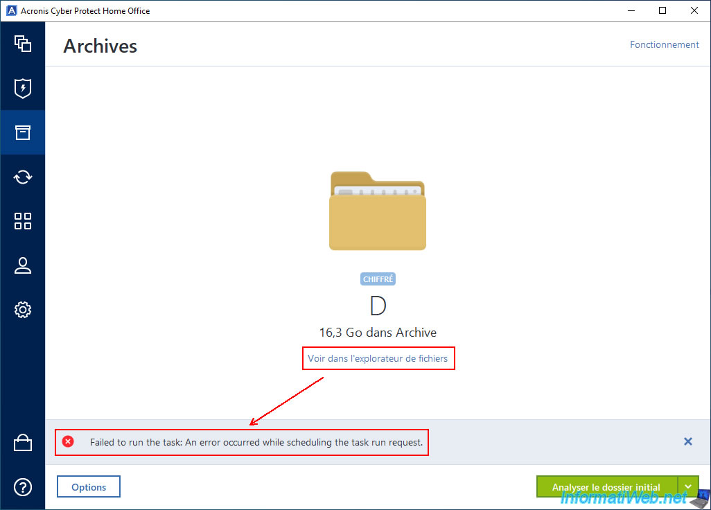 If he tries to open the encrypted archive from Acronis Cyber Protect Home Office (True Image), he will receive an error "Failed to run the task: An error occurred while scheduling the task run request" when he clicks on the "View in File Explorer" link.