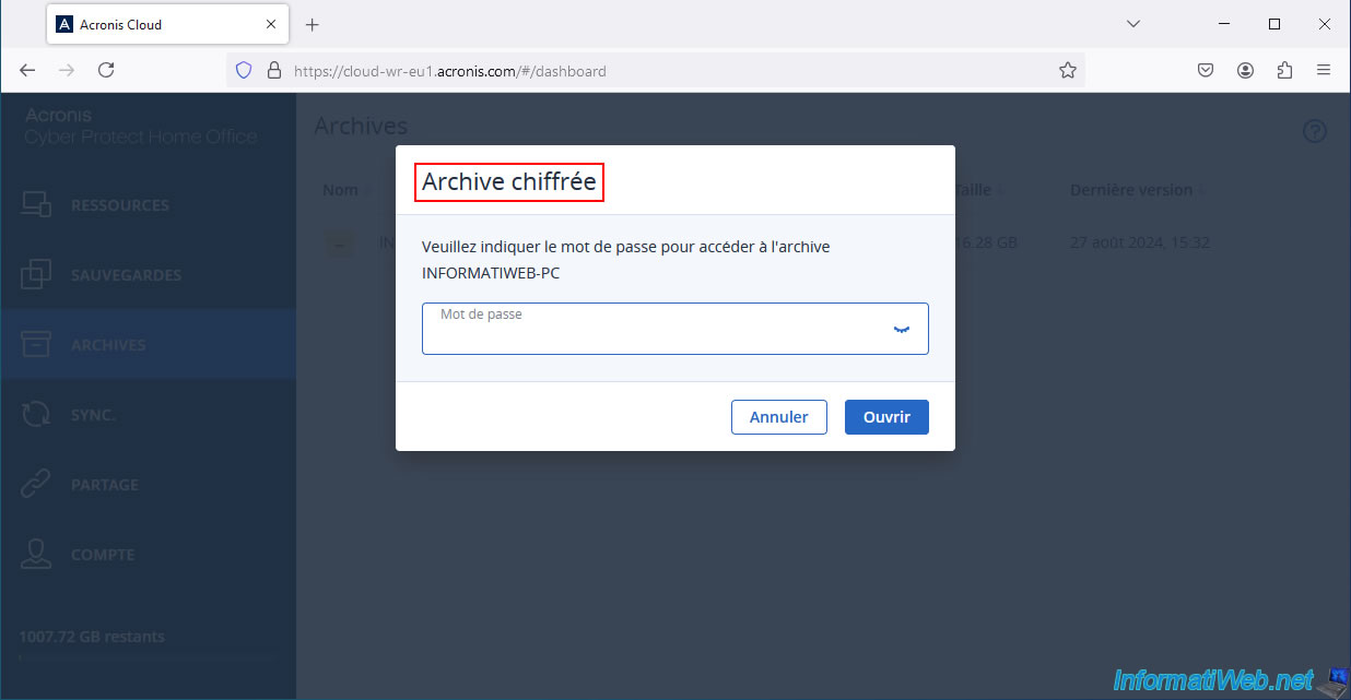 Of course, since this Cloud archive is encrypted, an "Archive encrypted" popup will be displayed when you try to access this archive via the Acronis Cloud website.