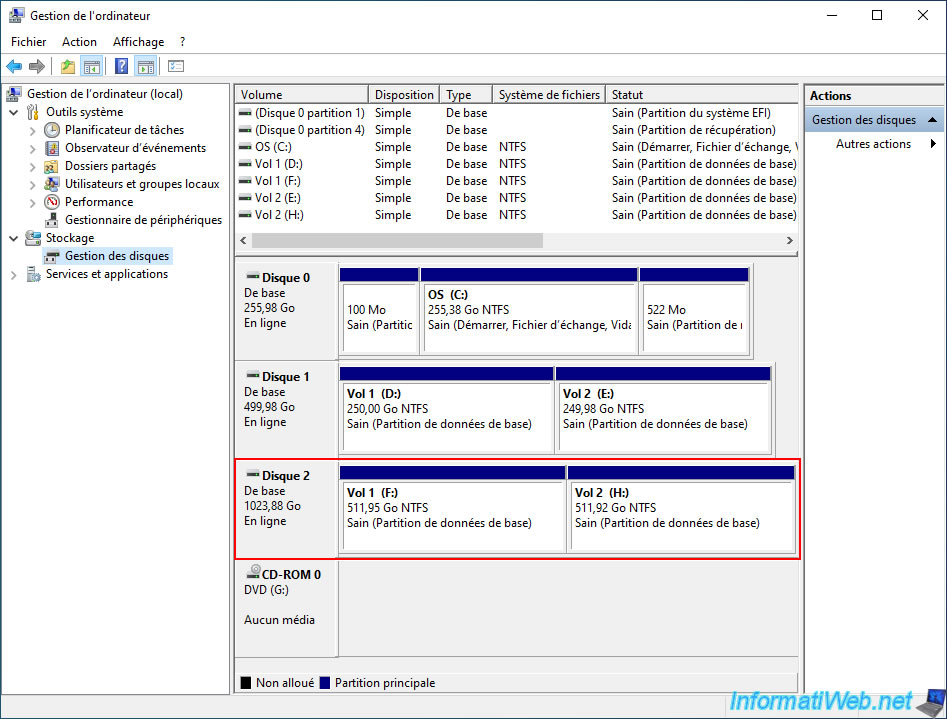 If you go to disk management, you will notice that your 2 disks have the same partitions and that the size of the partitions has been configured proportionally compared to the partitions of the source disk.