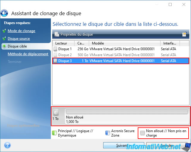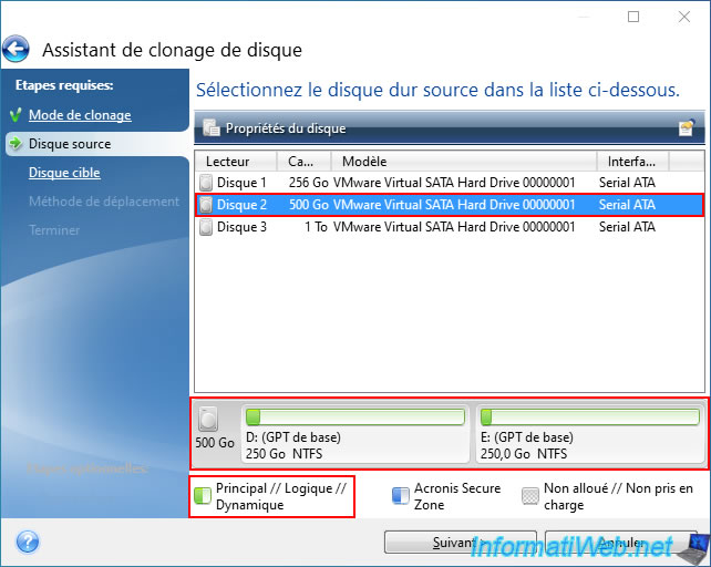 In our case: our 500 GB disk 2 (with our 2 250 GB partitions that appear at the bottom of the cloning wizard once this disk is selected).