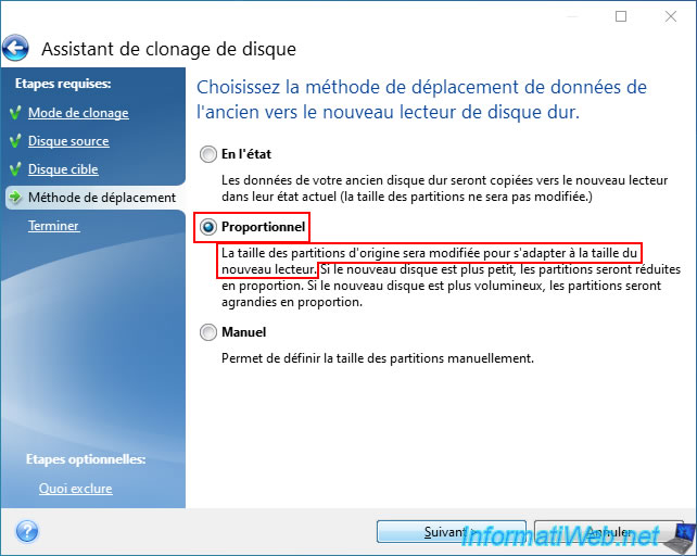 To automatically adapt the size of your partitions to your new hard disk (selected as the target disk), the best is to select "Proportional".