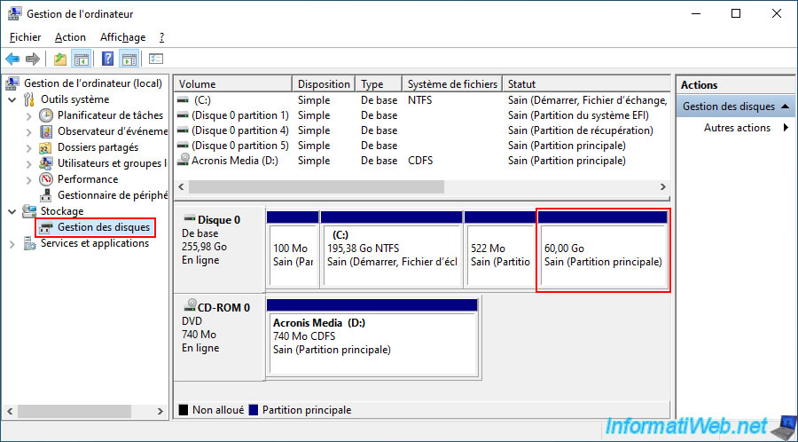 On the other hand, you will simply be able to see the presence of this 60 GB partition (in our case) in Windows disk management.