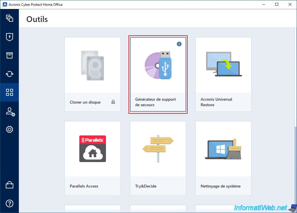 To turn your USB key into Acronis rescue media, go to the "Tools" section of Acronis Cyber Protect Home Office (True Image) and click "Rescue Media Generator".