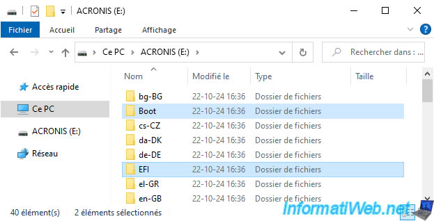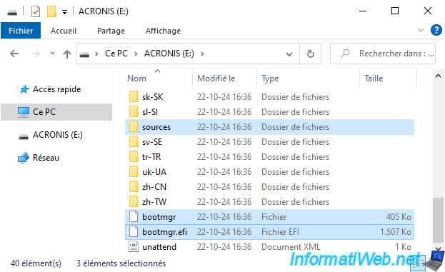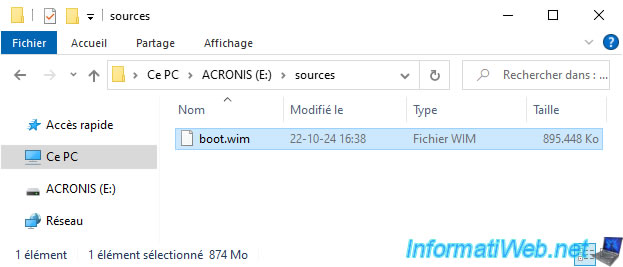 Once the Windows PE environment (and therefore the "boot.wim" file) has been modified by Acronis Media Builder, Acronis Media Builder will copy the necessary files (the "boot.wim" file, but also system files mainly used for booting on Windows PE) to your USB key.