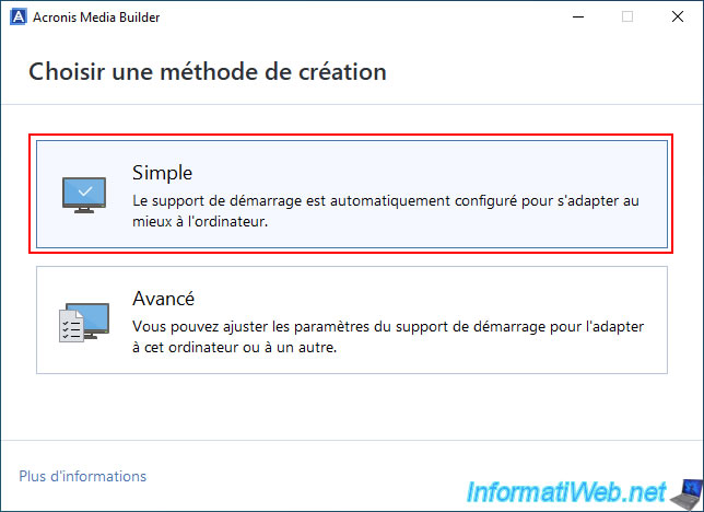 In the "Acronis Media Builder" window that appears, select "Simple" to create an Acronis bootable media that will be suitable for your computer.