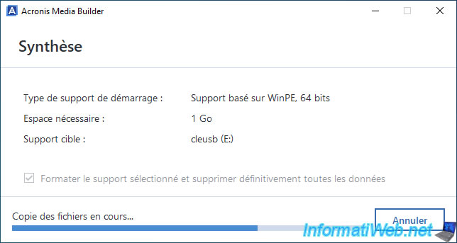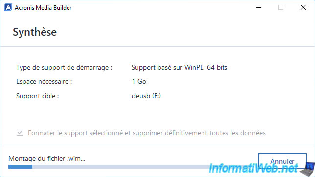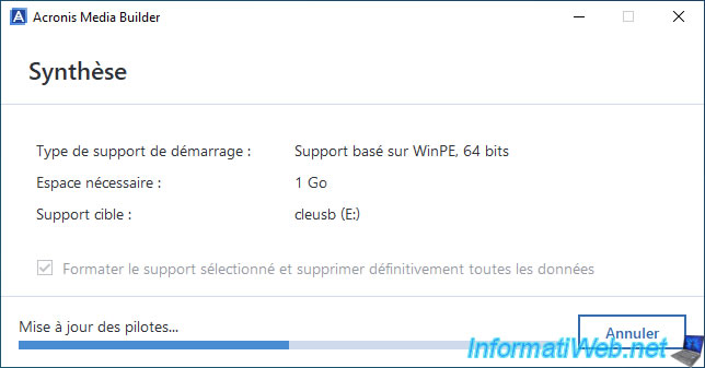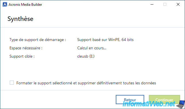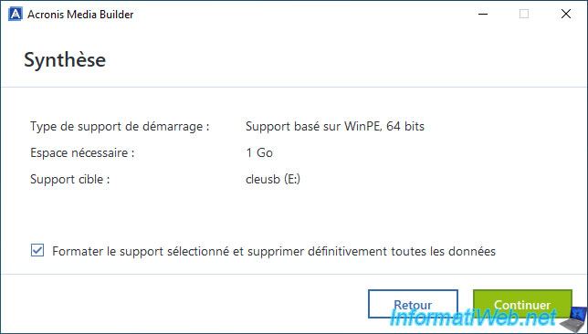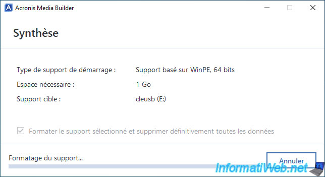 Warning : Acronis Media Builder will permanently erase all data on your USB key to create your Acronis bootable media.