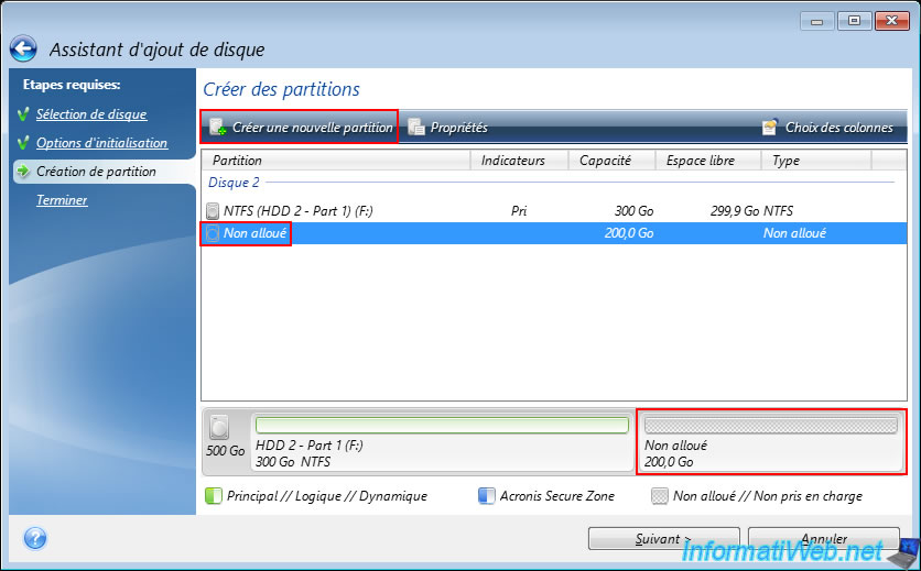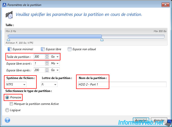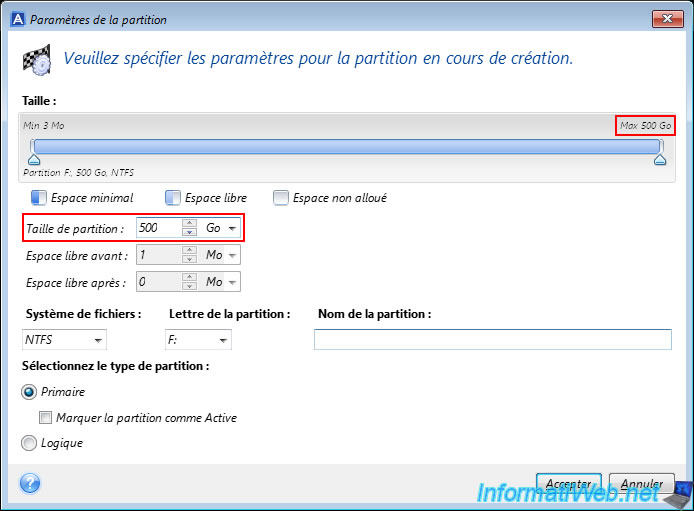 By default, the size of the partition indicated corresponds to the capacity of your physical disk.