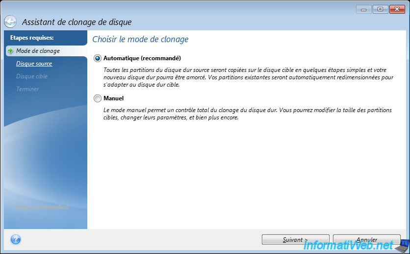 Leave the cloning word "Automatic" selected by default (because you will not validate this disk cloning anyway).