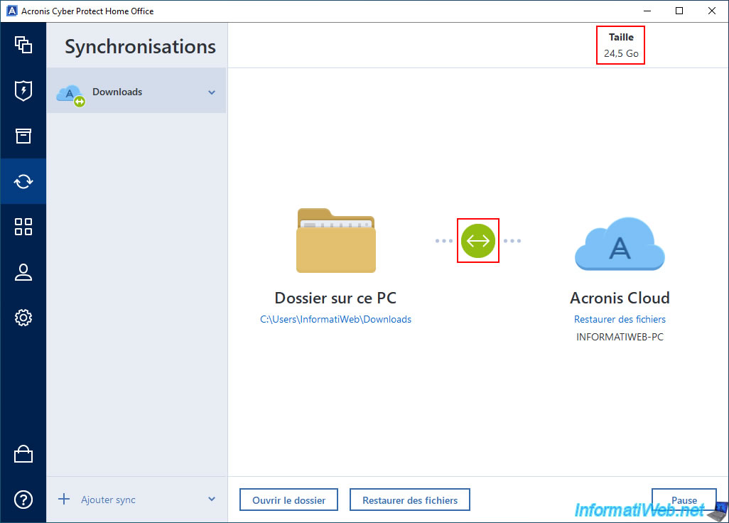 Again, in the Acronis Cyber Protect Home Office (True Image) interface, nothing changes for the synchronization status (except the size of the synchronized data displayed at the top right).