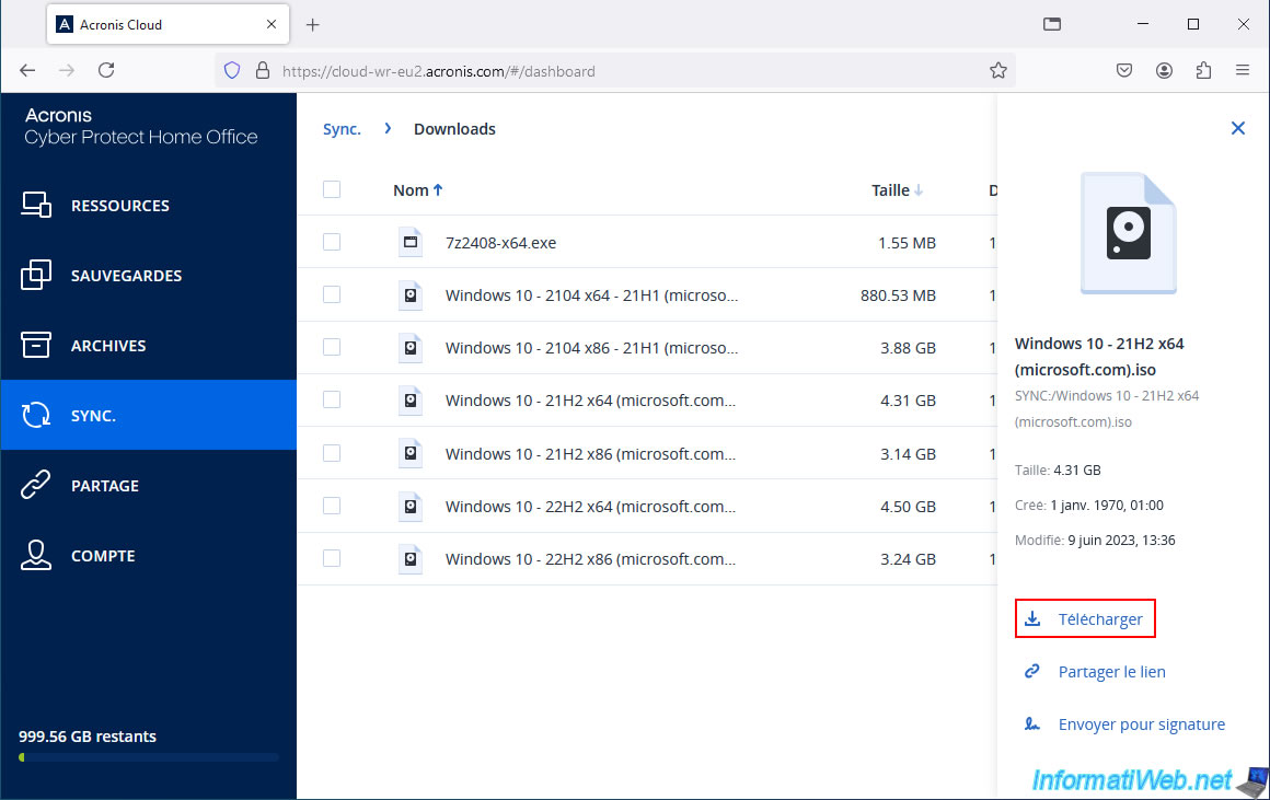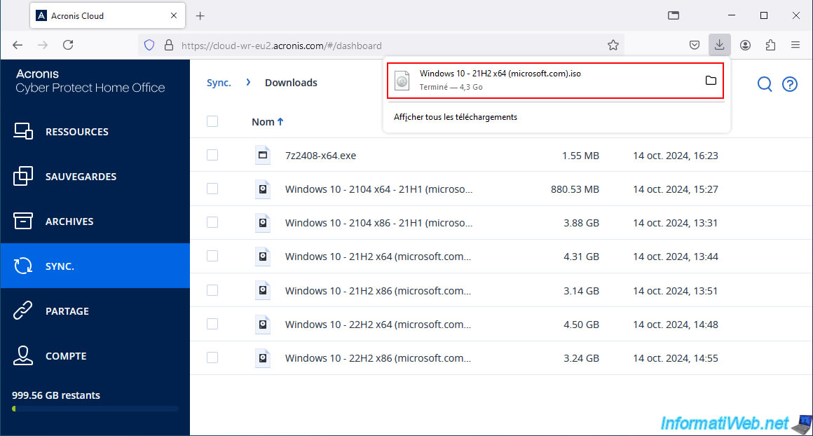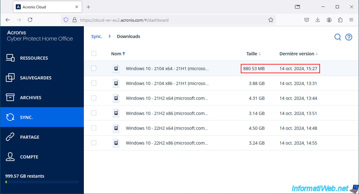 Important : again, there is a delay between the moment the green icon appears on the synced file visible in File Explorer and the moment this file will appear in the list of files available on Acronis Cloud for this sync.