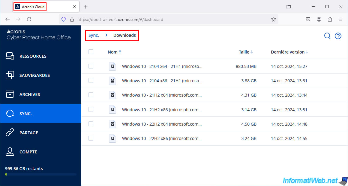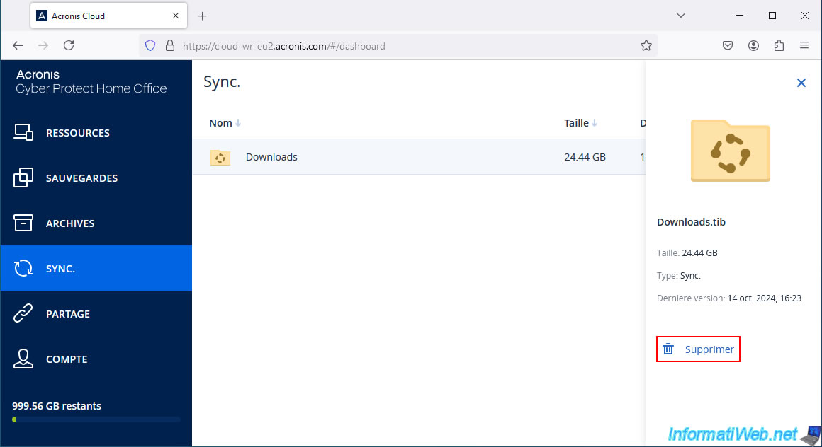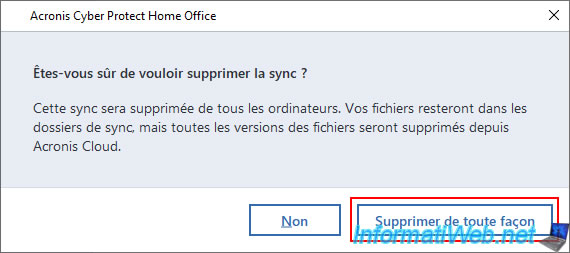 On the other hand, on Acronis Cloud, it is possible that the synchronized folder and its contents still appear (despite the warning from Acronis Cyber Protect Home Office (True Image) indicating that the data present on the Cloud would be deleted following the deletion of the synchronization).