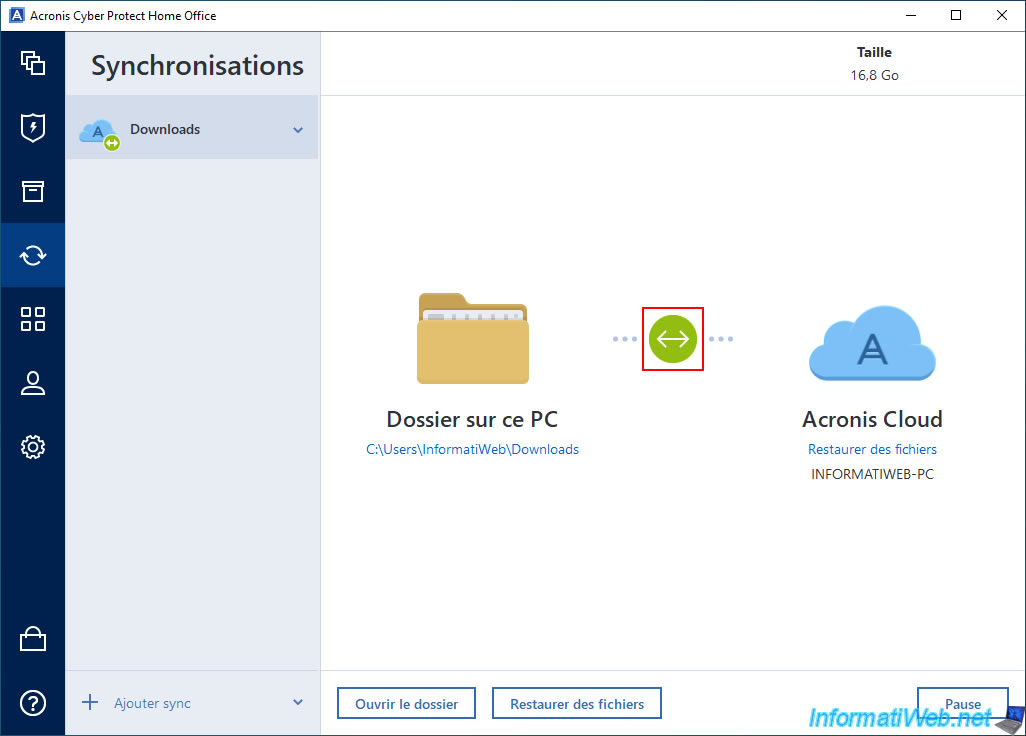 If you click "Sync" (on the left), you will notice that a size appears for the folder being synchronized (even if Acronis Cloud does not show you any files if you enter it).