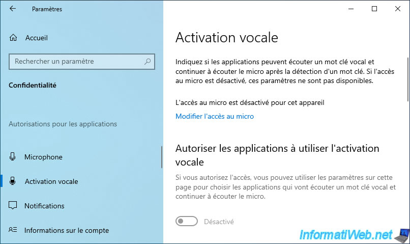 If access to your computer's microphone is authorized (thanks to the previous setting), you can authorize applications to use your microphone after saying a specific word (like : OK Google, ...).