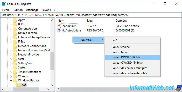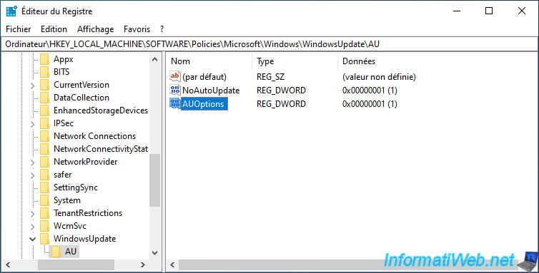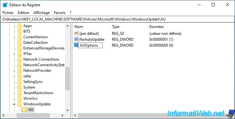 Go to the key (folder) : HKEY_LOCAL_MACHINE\SOFTWARE\Policies\Microsoft\Windows\WindowsUpdate\AU.